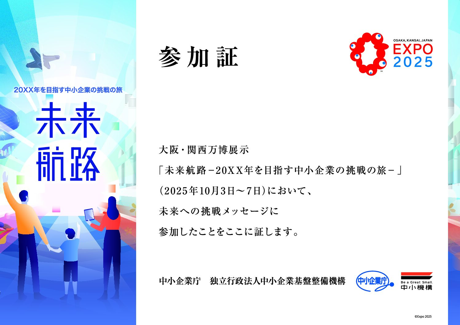 「未来航路-20XX年を目指す中小企業の挑戦の旅-」 2025.12.01ニュースリリース, 新着情報, 未分類 大阪・関西万博展示「未来航路-20XX年を目指す中小企業の挑戦の旅-」で未来への挑戦メッセージに参加し、参加証が届きました!!